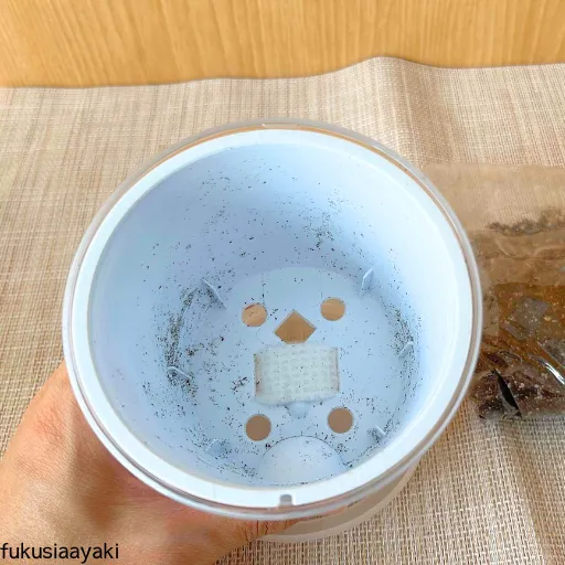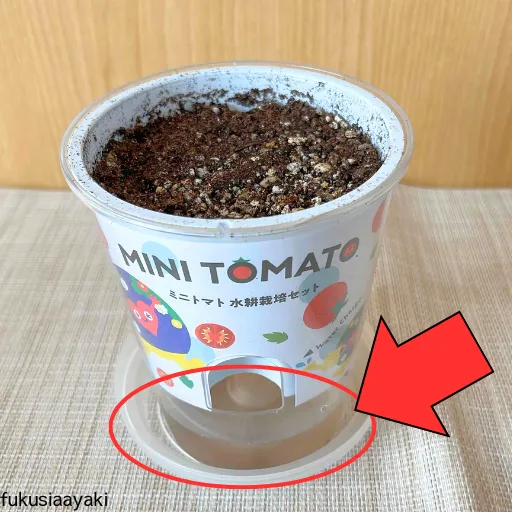 土を湿らせて出た濁った水を捨て、新しい水を吸水口から水位3㎝程入れる。